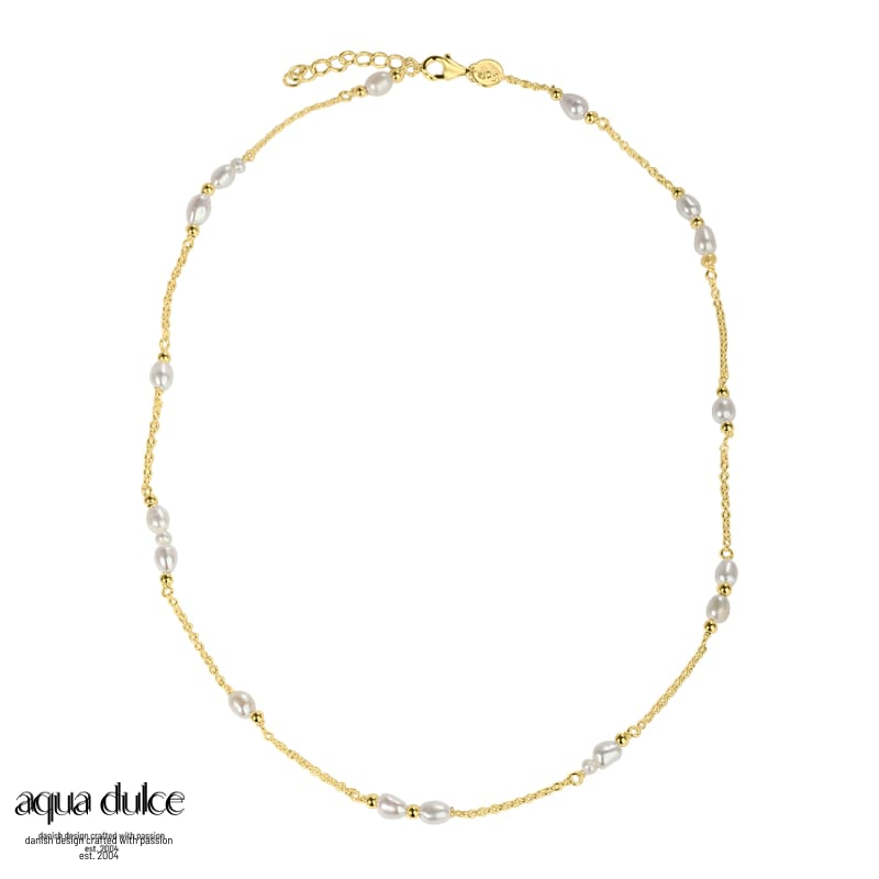42 cm. halskæde i forgyldt sterling sølv med ovale ferskvandsperler & små guld kugler.