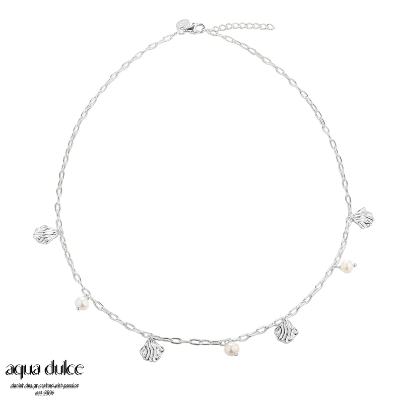 42 cm. kæde med bølgende vedhæng og hvide 5 mm. ferskvandsperler.