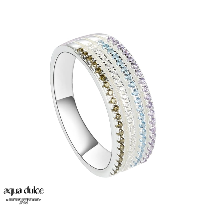 Fingerring med 4 smalle rækker af zirkonia, lilla, lyseblå, hvid & oliven.
