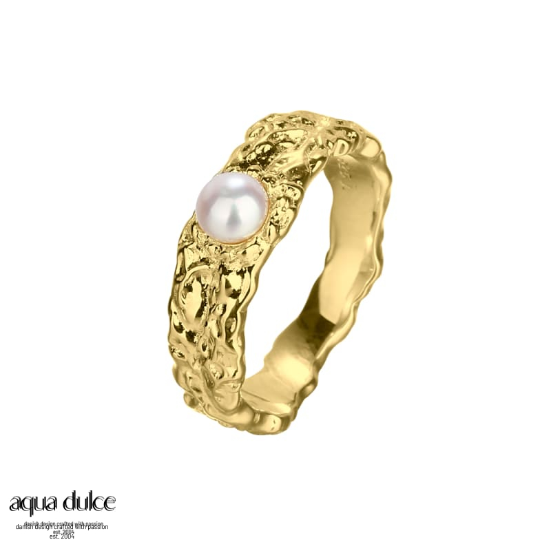 Fingerring i forgyldt sterling sølv med ruflet overflade & rund ferskvandsperle.