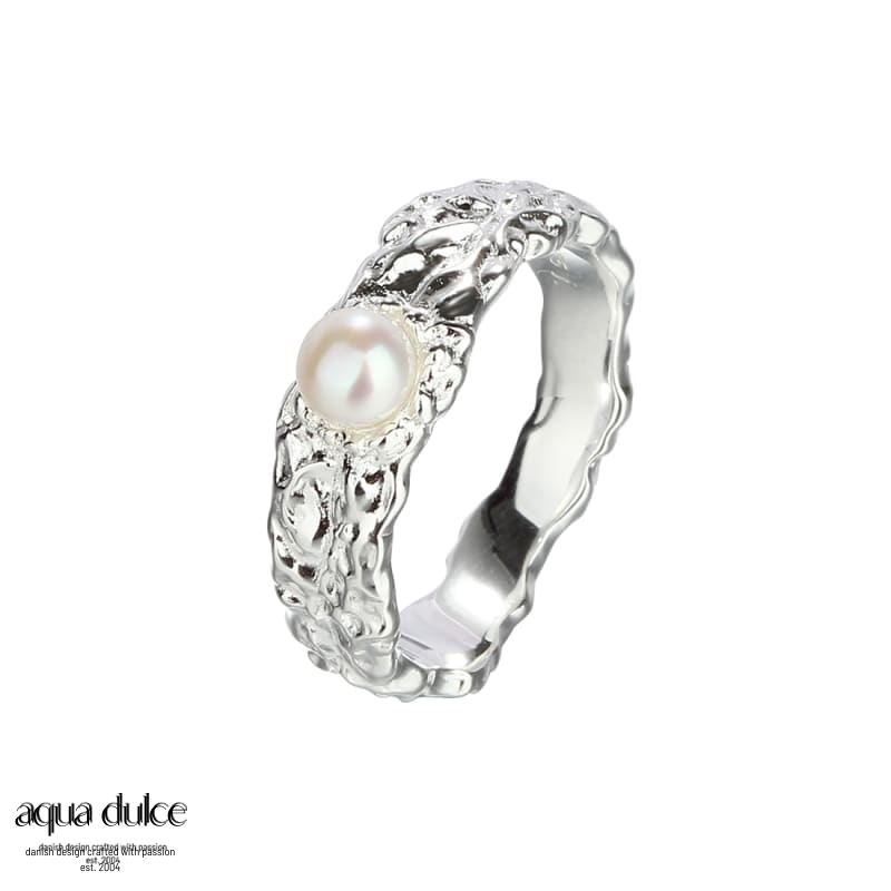 Fingerring i sterling sølv med ruflet overflade & rund ferskvandsperle.