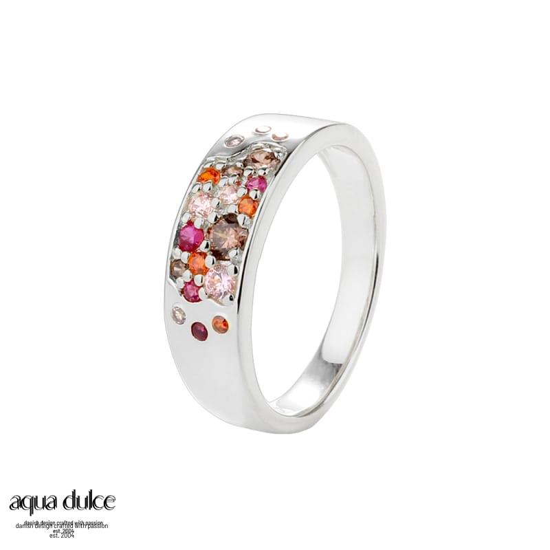 Fingerring med pink, smokey, orange & rosa zirkonia.