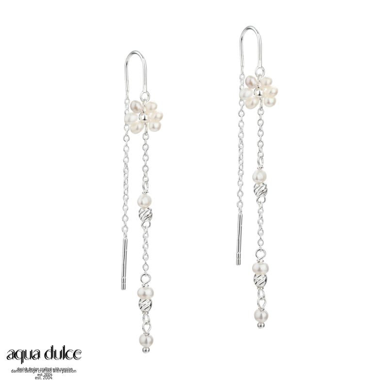Øretråde med hvide ferskvandsblomster, hvide perler & twisted kugler.