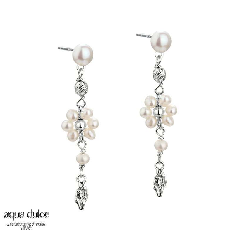 Ørestikker med hvide ferskvandsblomster, hvide perler & ruflet vedhæng.