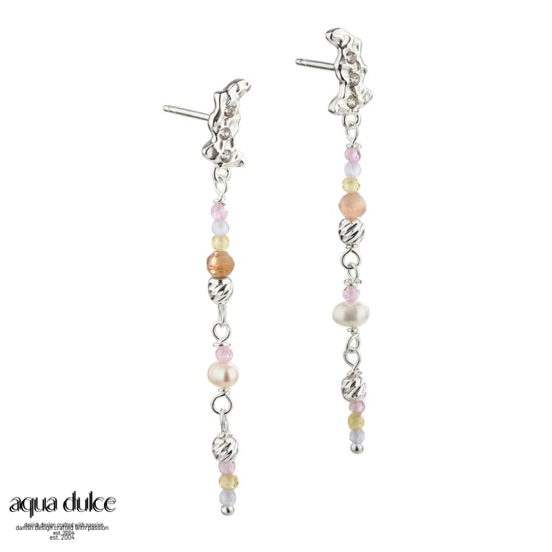 Ørestikker med ruflet vedhæng, zirkonia, halvædelsten & hvide ferskvandsperler.
