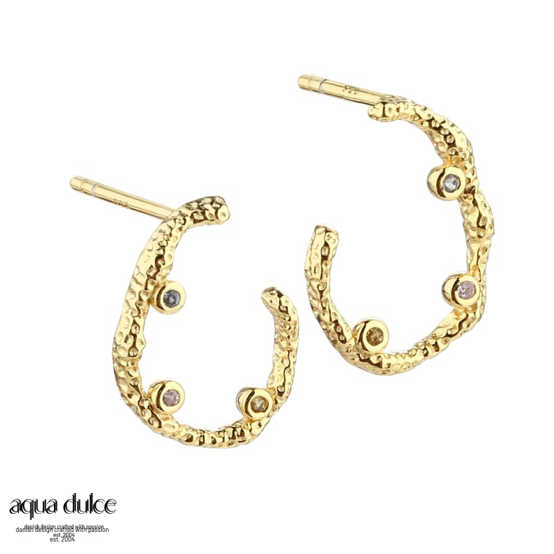Ørestikker med oval ruflet cirkel og 3 små farvede zirkonia.