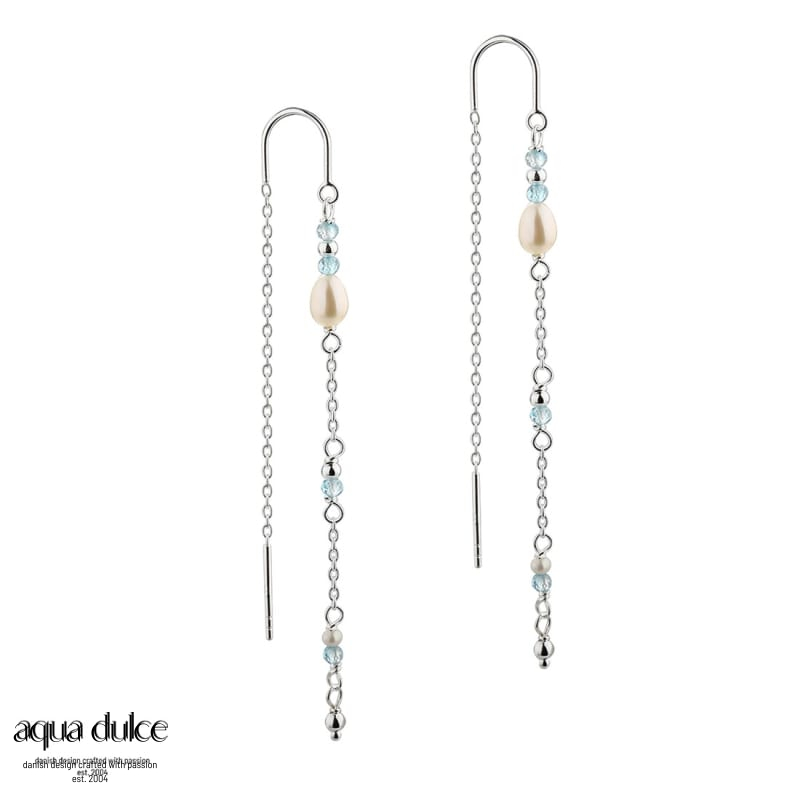 Øretråde med hvide ovale ferskvandsperler, små blå perler & sølvkugler.