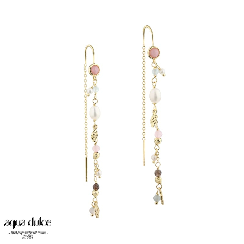Øretråde med rosa celcedonia, ferskvandsperler & halvædelsten.