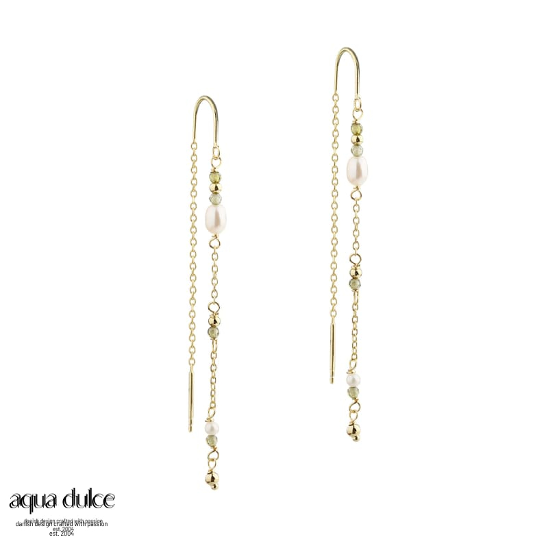 Øretråde med hvide ovale ferskvandsperler, små oliven perler & forgyldte sølvkugler.