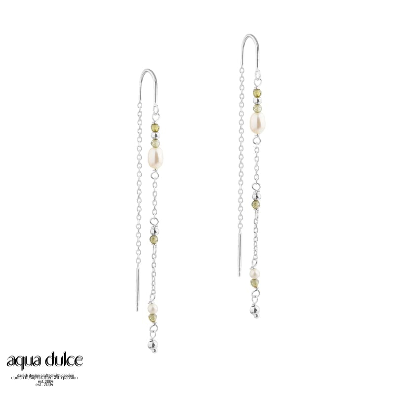Øretråde med hvide ovale ferskvandsperler, små oliven perler & sølvkugler.