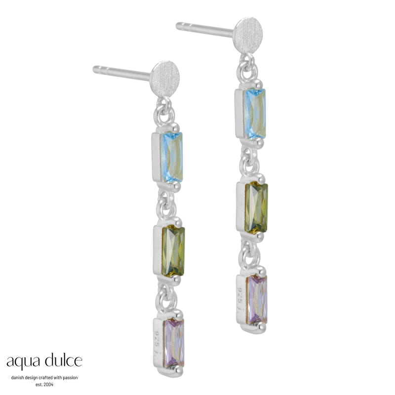 Ekstravagante ørestikker i Sterling sølv med mønter og vedhæng af pastelfarvede baguettesten.