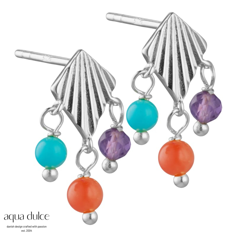 Sadie er fine ørestikker med firkanter med linier, og lilla, koral & turkis halvædelsten.