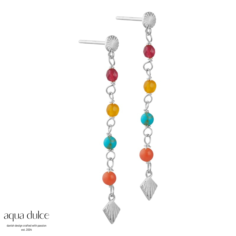 Susie er fine ørestikker med multifarvede halvædelsten på lang kæde.