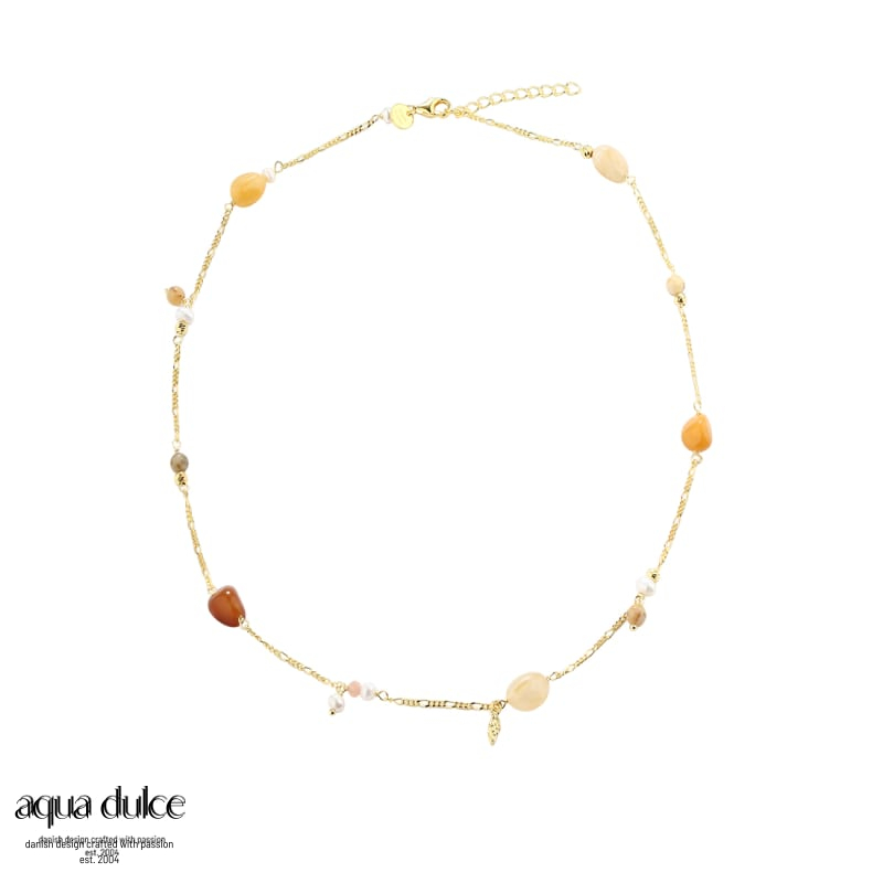 42 cm. kæde med gul jade, feltspar, ferskvandsperler & figaro kæde