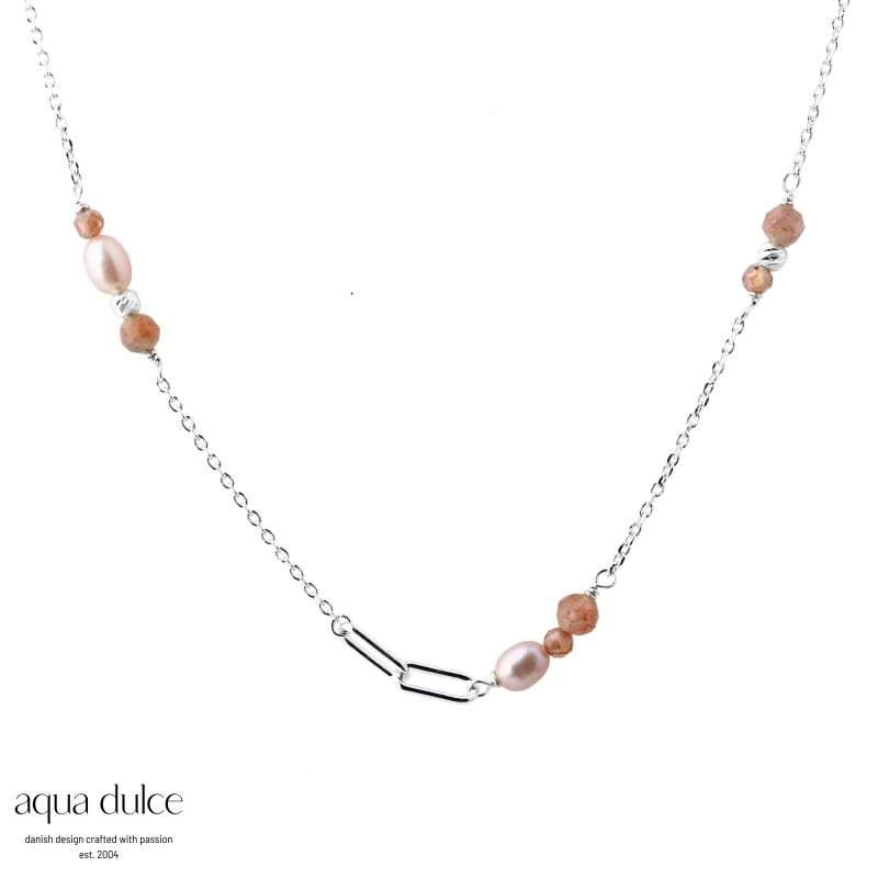 43 + 3 CM. SUNSTONE, FRESH WATER PEARLS & ZIRKONIA. / 925 STERLING SILVER