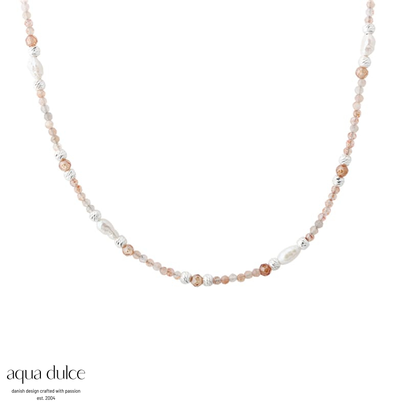 42 + 3 CM. FRESH WATER PEARLS, SUNSTONE & ZIRKONIA / 925 STERLING SILVER