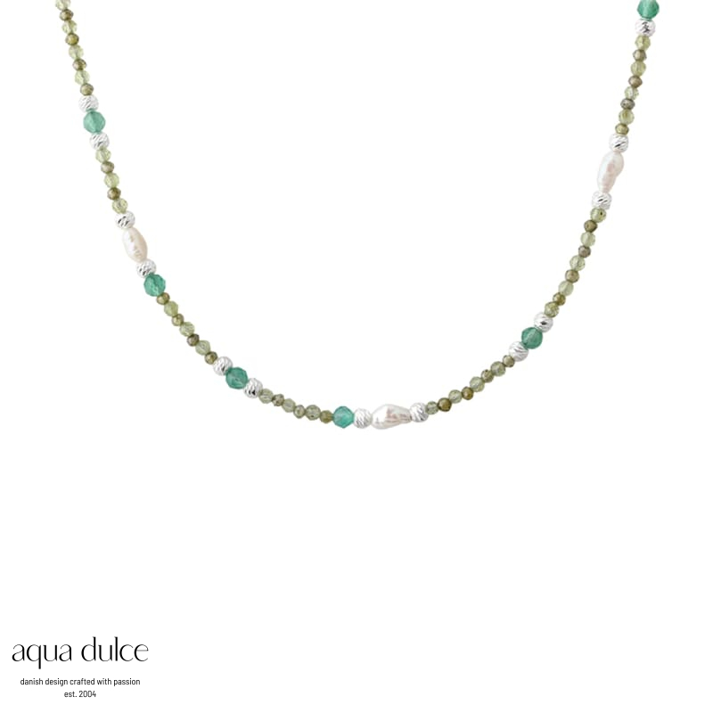 42 + 3 CM. GREEN AGATE, ZIRKONIA & FRESHWATER PEARLS / 925 STERLING SILVER