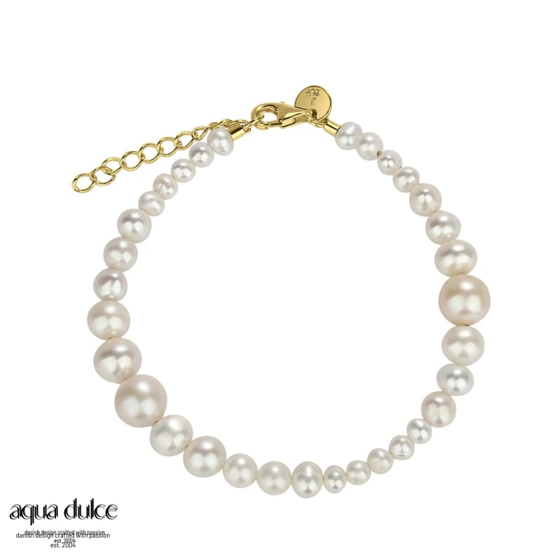 Armbånd med skønne hvide ferskvandsperler i forskellige størrelser. Med forgyldt sterling sølv lås.