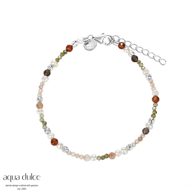 Armbånd med rosa, oliven, røg og rust halvædelsten, perler & twistet sølvkugler.