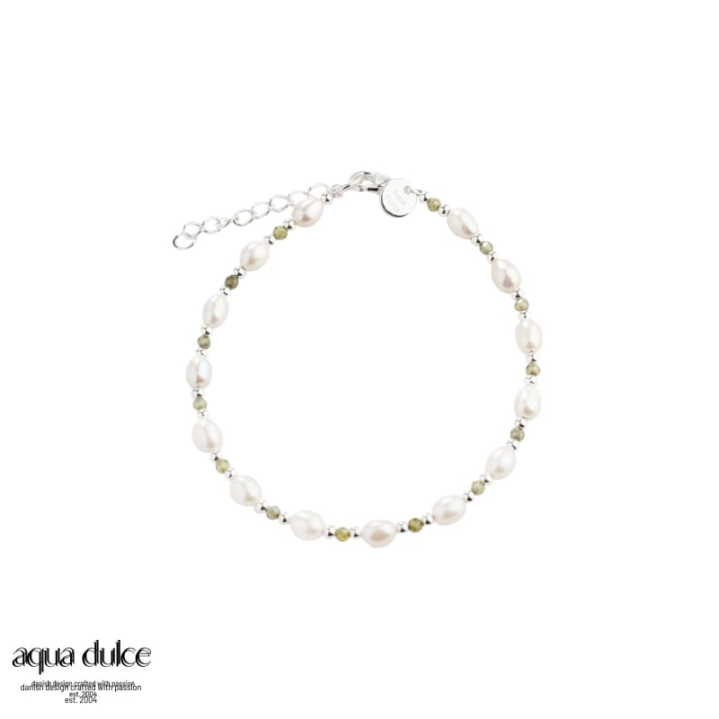 Armbånd med hvide ferskvandsperler, oliven perler & små sølv kulger.