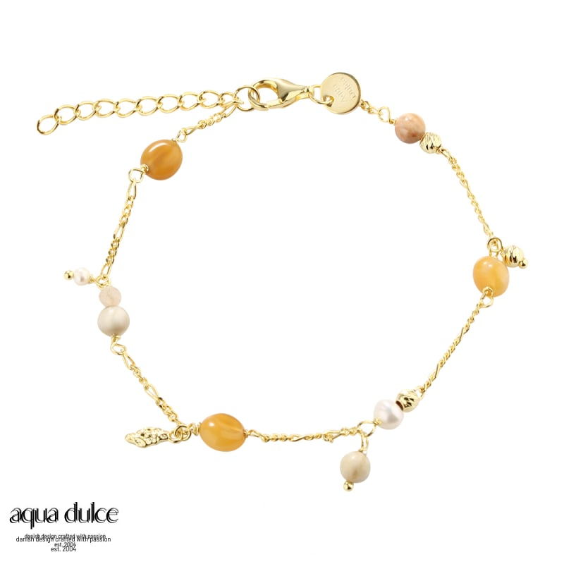 Armbånd med gul jade, feldspar, sunstone & hvide ferskvandseperler.